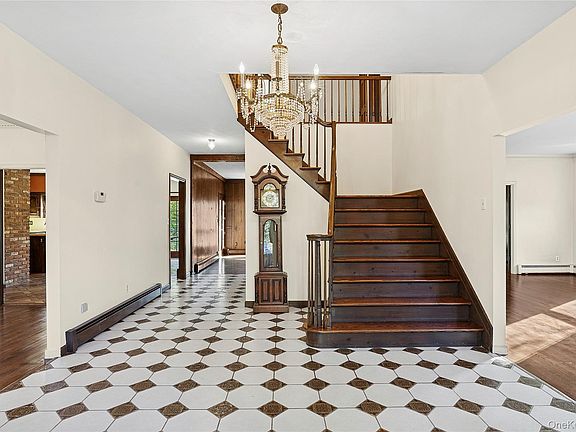 Set on two exceptional acres at the end of a private cul-de-sac, this classic 5-bedroom, 4-bath Colonial offers timeless elegance, privacy, and a rare connection to Long Island’s storied estate era. A long, sweeping driveway leads to the residence, which sits elevated on the property, creating a stately first impression against its beautifully wooded surroundings.