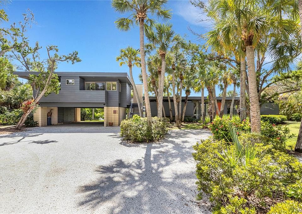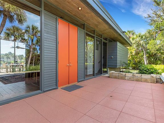 In the coveted Sandy Hook Gulf Beach enclave of only 42 homes, this unique Mid-Century Modern home is now offered for purchase for the first time since 1983. The one-of-a-kind mid-century modern retreat rests on 1.6 acres of serene lakefront adjacent to where Big Sarasota Pass meets the Gulf of Mexico. Created by Frank Folsom Smith, a noted member of the Sarasota School of Architecture, this passively designed treasure was crafted from local cypress, oak, terra cotta and Ocala block and sits harmoniously within a lush Florida-native landscape alive with palms, cedars, and blooming wild flora. Nature lovers will delight in the lake along the southern edge of the property, home to a vibrant array of wildlife. The main residence, built in 1964 and lovingly preserved by its current owner since 1983, features timeless modernist design and abundant natural light through true north and south facing 10-foot glass sliders that welcome daylight. Meanwhile the interiors are shielded from direct sun for restful living. The guest house, added in 1987, also designed by the firm, complements the main home, together offering 5 bedrooms, 3 full bathrooms, 2 expansive great rooms, and a rare wood-burning fireplace, perfect for cozy winter evenings. Outdoors, all residents can enjoy their choice of sun-dappled terraces or shaded garden hideaways beneath more than 120 mature palms and cedars. Thoughtful upgrades ensure comfort and ease in this home's remodeled kitchen with all new appliances, new Trane HVAC systems covered by 10-year warranties, a 2025 deep-well irrigation system, and low-voltage outdoor lighting synchronized by the integrated atomic clock for effortless ambiance. Just a 150-meter stroll west through the trees leads you to Sandy Hook’s exclusive residents-only Gulf beach, a secluded paradise of sugarwhite quartz sand where sea turtles hatch annually and dolphins and manatees play offshore and sunsets paint the sky in vivid color. Conveniently located near Siesta Village’s boutiques and restaurants, and within easy reach of top-rated Sarasota County schools, The Out-of-Door Academy, and Sarasota Memorial Hospital, ranked among America’s top 50, this home offers the perfect blend of mid-century authenticity, privacy, and coastal lifestyle. This truly rare architectural offering is where Siesta Key’s natural beauty and Sarasota’s cultural soul meet the timeless artistry of mid-century design.
