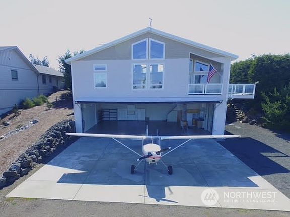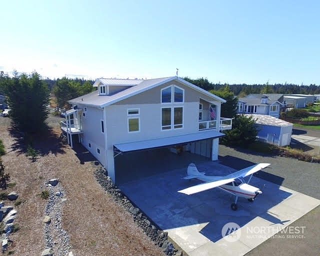 Welcome to unique aviator-designed hangar home on 1/2 acre, backing private Diamond Point Airport-2WA1...20 ft vaulted ceilings & windows w/views of the Strait & beyond, designed for comfort w/heated floors in a large great room, 2 master bedrooms w/2 full baths, kitchen, walk-in pantry, dedicated laundry area, 3/4 bath & large room for den/office/3rd bedroom, open loft w/spiral staircase too! Large deck & covered patio plus generator & RV hookup. Detached cottage w/green room, murphy bed/desk, kitchen area & 1/2 bath. Walk downstairs to 1,760 sqft hangar w/heated floor, 3/4 bath & kitchen. Dedicated taxiway from home to paved runway (2,335 ft, 262' elev). Hangar's bi-fold door is 12 ft clear H w/door open, 44 ft clear W & 110v motor/cable.