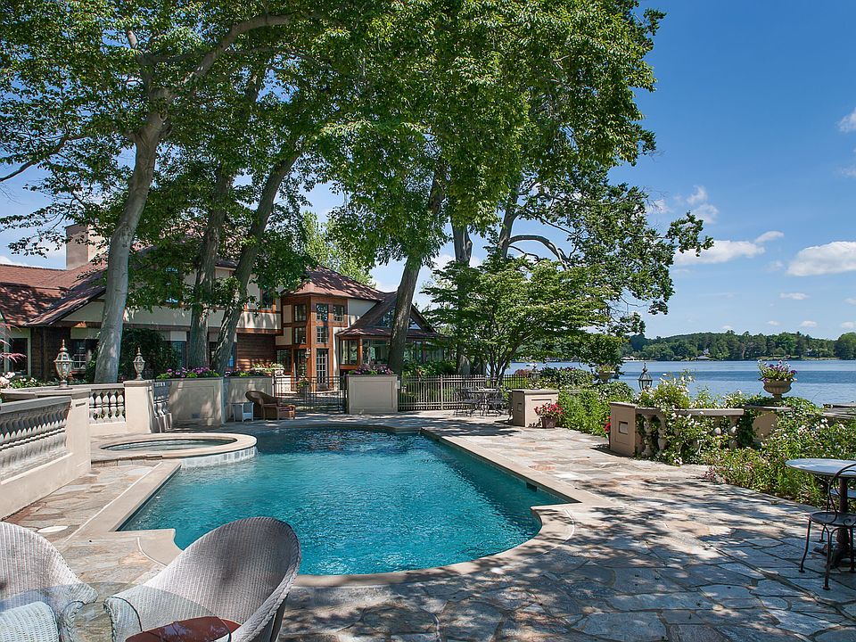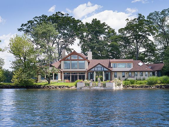 Only steps away from water's edge, this breathtaking one acre estate takes full advantage of irresistible vistas and is artfully integrated into the surrounding land and waterscape. Soaring ceilings, richly crafted wood cabinetry and floors, hand-forged ironwork, handsome fireplaces, and exquisite detail throughout create a unique and inviting backdrop for sophisticated living while massive glass windows showcase the mesmerizing water views. Year-round residence or perfect weekend getaway.