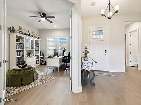 Welcome to luxury living in the heart of Nocatee! This beautifully designed Toll Brothers Mickler Plan offers 4 spacious bedrooms, including 2 private guest suites, a bonus room, & dedicated office. The gourmet kitchen features stacked cabinetry, a 5-burner gas range, KitchenAid stainless steel appliances, easy-close cabinets & drawers, tile backsplash, & a sunny breakfast room. The great room impresses w/ sweeping ceilings & a sleek linear tile gas fireplace w/ a wooden mantle. Elegant wood floors on the first floor, wood stairs, plantation shutters, & thoughtful touches like light switches w/ built-in night lights. Retreat to the primary suite w/ a luxurious vessel tub, dual vanities, an oversized seamless tile shower with dual shower heads & an impressive walk-in closet. Enjoy a preserve view from the paver lanai. Additional highlights include a 3-car garage, paver driveway, laundry room with sink & cabinets, & 2 AC units. Located just moments from Nocatee's award-winning amenities