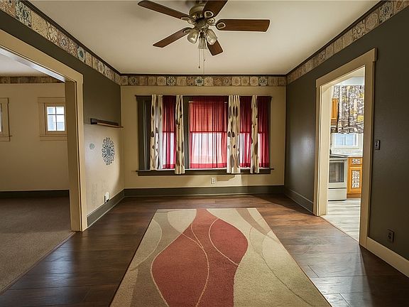 The spacious living room filled with natural light, warm neutral tones, and charming craftsman-style trim throughout. The adjoining dining room provides a perfect space for gatherings and connects seamlessly to the bright kitchen. The kitchen offers ample counter space, generous cabinetry, updated flooring, and convenient access to the backyard.