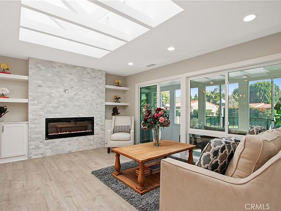 RENOVATED COOP! A recently renovated two bedroom, two bathroom home is now available and located in Laguna Woods Village, an HOA managed 55+ community within South Orange County, CA. NO EXPENSE WAS SPARED during the renovation of this popular "Casa Linda" floor plan. The home is ground floor/street level with no stairs leading to and from the nearby carport. The home features new plank style flooring along with premium tile/stone upgrades throughout. The upgraded kitchen features premium white shaker style cabinetry and includes stainless steel appliances. The living room has a massive skylight with exposed truss work and a custom built-in entertainment center with an electronic fireplace and is pre-wired for flat screen TV mounting. The master bedroom includes a walk-in closet, a private master bathroom with a generously size shower and floating bench. The guest bedroom features balcony access and a guest bath with a skylight for added natural sunlight. The home includes a stacked washer/ dryer and a recently installed central heating and cooling system. There is also a private enclosed balcony overlooking the neighborhood. There is a detached carport (#456-5) a short walk from the home and ample public parking spaces nearby. Laguna Woods Village is a thriving community with many activities to enrich your lifestyle! The monthly HOA includes property taxes, utilities (water, trash, cable TV), and maintenance of exteriors. *Unit is virtually staged.