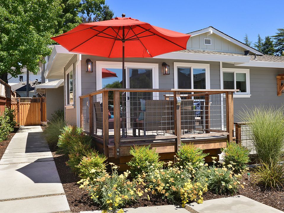 The outdoor deck and garden area provide a tranquil extension of your living space. Enjoy morning coffee surrounded by lush landscaping or evening wine as the sun sets over the oaks. With privacy fencing, comfortable lounge seating, and soft outdoor lighting, it's an ideal spot to relax or entertain small gatherings.