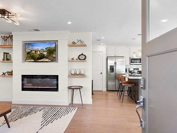 The open-concept living room invites you to unwind in style. Relax by the charming fireplace, stream your favorite shows on the Smart TV, or curl up with a glass of cabernet after a day exploring wine country.