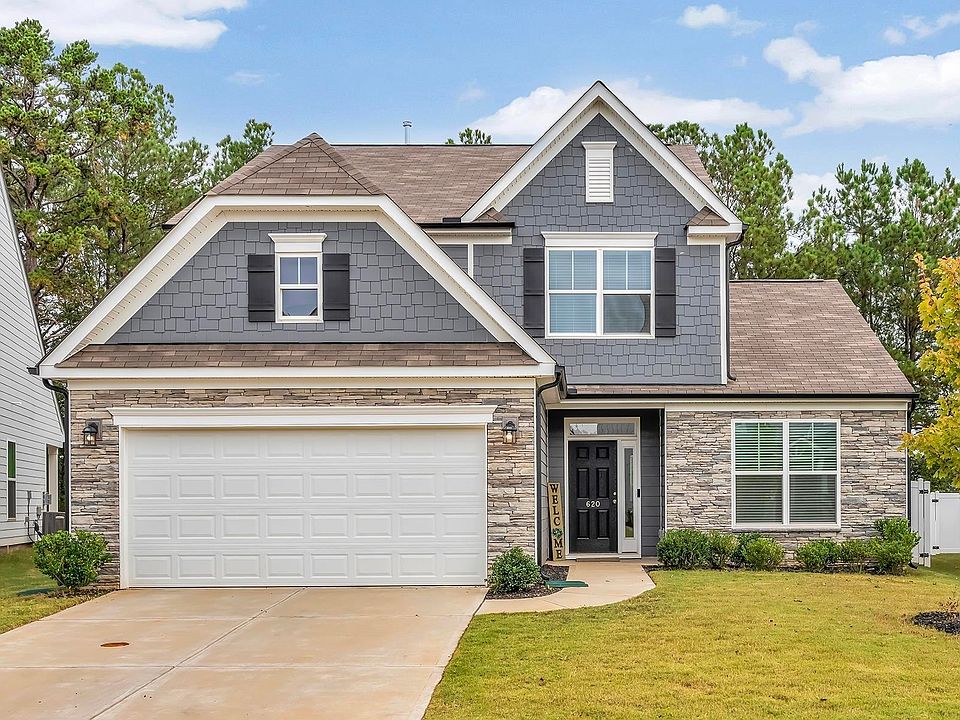 Welcome to 620 Columbus Circle, a stunning craftsman-style home built in 2024 nestled in the highly sought-after Greenrich Mill community of Simpsonville. This 3-bedroom 2.5-bath residence combines timeless charm with modern comfort, offering undeniable curb appeal and a warm inviting presence from the moment you arrive. The stone and hardboard exterior accented with detailed trim set the stage for the craftsmanship inside. Step into a welcoming foyer framed with elegant wainscoting that makes an immediate statement. To your right, a versatile office or flex room awaits, perfect for a home office, study nook or dining room. The open living area is truly a showstopper with soaring 16-foot ceilings and a dramatic floor-to-ceiling gas fireplace flanked by oversized windows that bathe the space in natural light. The seamless flow into the kitchen and dining area creates the perfect environment for entertaining and everyday living. At the center of it all, the kitchen shines with a large granite island, shaker-style cabinetry, subway tile backsplash and sleek stainless-steel appliances with a gas stove hookup, all illuminated by recessed lighting for a bright modern touch. Conveniently located on the main level, the primary suite offers a relaxing retreat with a spa-like tiled shower, granite countertops and a spacious walk-in closet. Upstairs, a generous loft serves as a media lounge, second living room or hobby space, while two additional bedrooms and a full bath provide plenty of space for family or guests. Step outside to enjoy a spacious back patio overlooking the large level fully fenced backyard, ideal for pets, play or gatherings with friends. A two-car garage adds convenience and storage. With thoughtful design, a flowing floor plan and quality finishes throughout, this nearly new home offers move-in-ready comfort and low-maintenance living in a prime Simpsonville location just minutes from schools, shopping and parks.