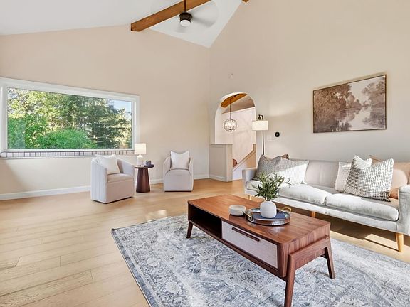 Tucked away in a quiet valley and embraced by towering redwoods, this inviting mountain home is the ideal getaway for those craving serenity and a close connection to nature. Designed to harmonize with its surroundings, the home features soaring ceilings, expansive windows, and sliding glass doors that flood the space with natural light and forest views. Perfect for indoor-outdoor living and entertaining, the open-concept layout flows easily onto a private patio, ideal for grilling, relaxing, or gathering with friends. In the heart of the home, the kitchen and dining area are warm and welcoming, with plenty of space for hosting.