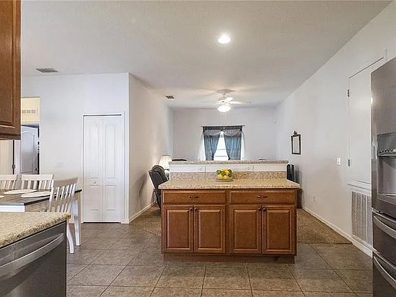 The modern kitchen offers stainless-steel appliances, generous cabinetry and counter space, and a large island that opens to the living and dining areas. The primary suite includes dual vanities, a garden tub, walk-in shower, and private lanai access.