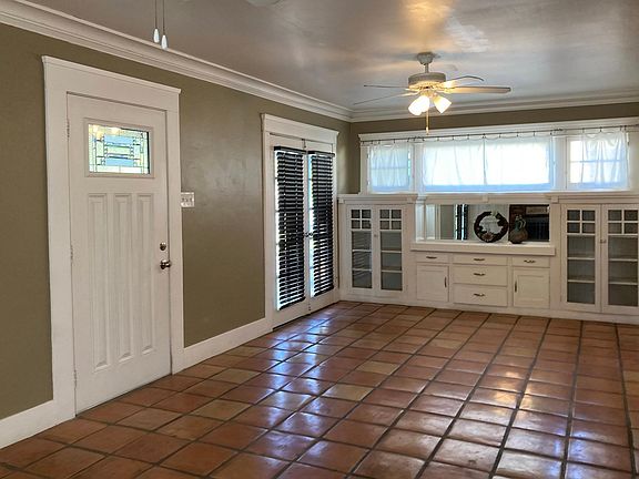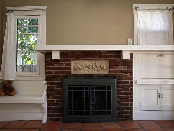 The two-bedroom, one-bath home features tile floors and a neutral color scheme, plus original 1919 windows and built-in cabinets, window seat, fold-down desk, bookcase, and wood burning fireplace. Updated kitchen has room for small table and two chairs, and features granite countertops and Frigidaire stainless steel appliances: range/oven, refrigerator, microwave, and dishwasher. Indoor laundry features high-efficiency washer and dryer.