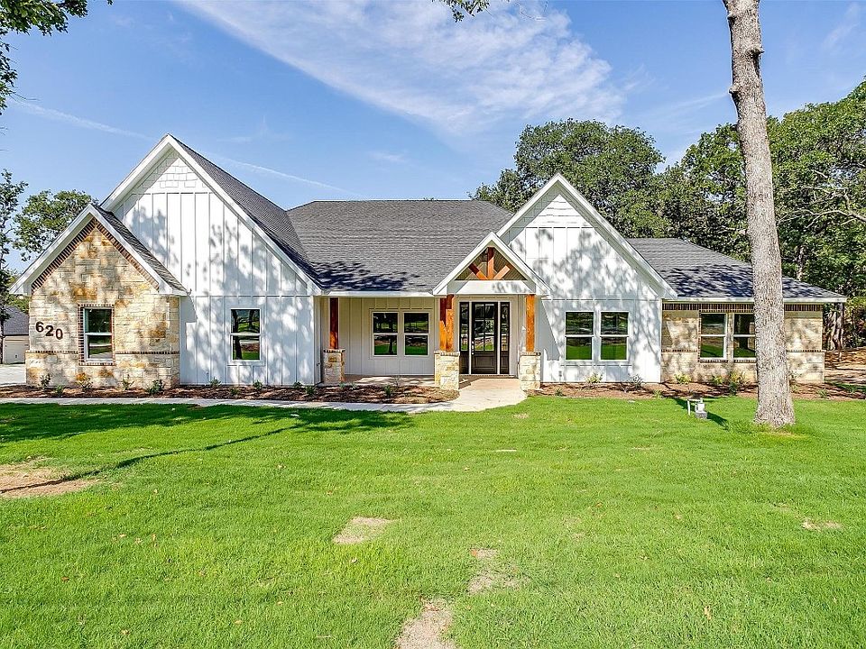 Spacious new construction home located on a 2-acre wooded lot in the highly desirable Deer Glade Estates subdivision. This elegantly designed 4-bedroom 2.1 bath, 2 car garage contemporary home has an open floor plan with living room, fireplace, open kitchen with kitchen island and dining area. Kitchen has quartzite countertops and stainless-steel appliances. Large covered back porch that is perfect for enjoying your morning coffee or watching the sunset. Schools nearby. Conveniently located in close proximity to Fort Worth, Azle & Weatherford. No city taxes!