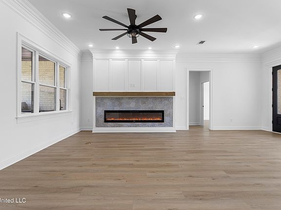 From the moment you step inside, you'll be captivated by the high ceilings, layered crown molding, designer lighting, and top-of-the-line luxury vinyl plank flooring that flow throughout the home. The inviting living room features a custom feature wall with an electric fireplace, creating a warm and elegant focal point surrounded by abundant natural light.