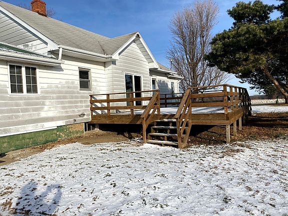 Edge of town living that still offers city, water, sewer and garbage pick up! 2.8 acres of space with a 30x50 steel building with it's own 100 amp service and newer cement floor. Home has a large mudroom/laundry, nice sized kitchen and very open spacious dining and living rooms. Dining area has patio doors to the large deck. Fireplace in living room is decorative only as chimney was removed when steel roof was put on. Newer tub surround in centrally located bath. Open basement could be used for storage or more living space. Access to garage from basement as well as into house. Seller is expecting the shed and additional building and pool to be moved off premises by closing as well as other items. The semi trailer stays on property as a sturdy storage shed.
