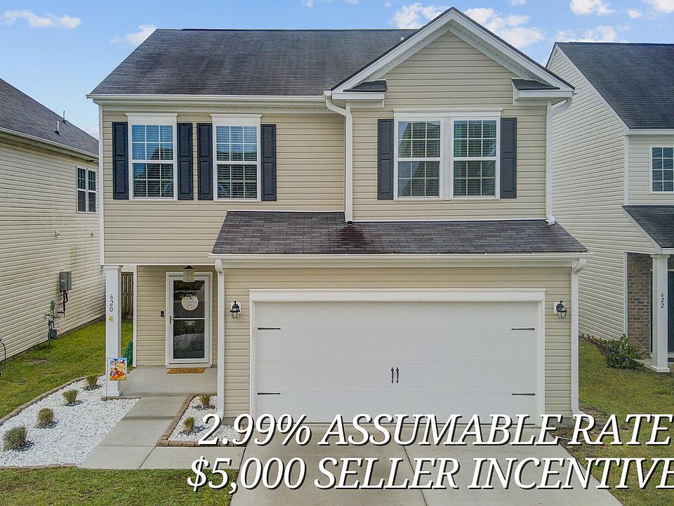 This charming home is perfect for those seeking a simpler way of life! With a potential 2.99% Assumable Interest Rate!! and $5000 Buyer Incentives!! Discover the charm of this thoughtfully designed two-story Berkeley plan in Lindera Preserve. With 3 bedrooms, 2.5 baths, and 1,645 square feet of stylish living space, this home blends comfort, functionality, and a touch of Lowcountry warmth.Step inside to a bright, open layout where natural light fills the main living areas. The spacious family room connects effortlessly to the dining area and kitchen, perfect for everyday living and entertaining. The kitchen features granite countertops, subway-tile backsplash, modern cabinetry, and a convenient breakfast bar.Upstairs, the private owner's suite includes a generous walk-in closet and a spa-inspired bath with dual sinks, a soaking tub, and a separate shower. Two additional bedrooms and a versatile loft space provide plenty of room for guests, a home office, or a hobby area. The laundry is conveniently located on the same level for easy living. Located in the sought-after Cane Bay community, Lindera Preserve offers resort-style amenities including pools, playgrounds, nature trails, dog parks, and more. Nearby, you'll find schools, shopping, dining, and the Cane Bay YMCA all within minutes of home. Enjoy the perfect blend of community and convenience in one of Summerville's fastest-growing areas. Welcome home to 620 Redbud Lane where every day feels a little like vacation. Charleston International Airport - 24 Miles Joint Base Charleston - 14 Miles Downtown Historic Charleston - 33 Miles Downtown Historic Summerville - 12 Miles