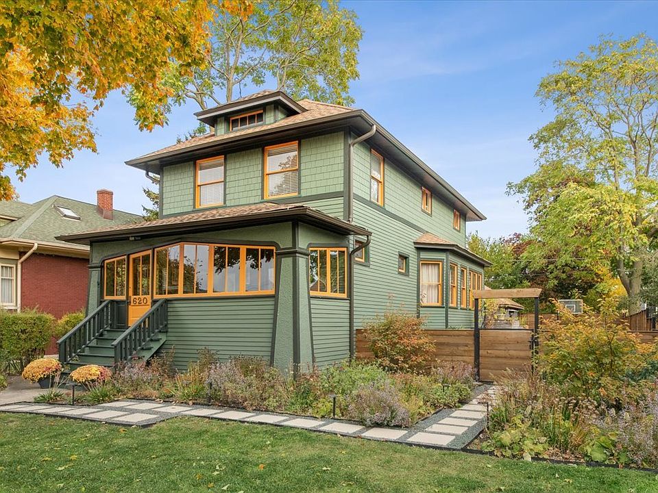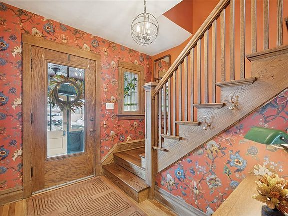 Welcome to this charming four-square home on an extra-wide lot, perfectly situated on one of Oak Park's most desirable tree-lined blocks-just minutes from the best shops, parks, and restaurants the village has to offer, plus easy access to the Blue Line, Green Line, and the Metra. Beautifully maintained, this home blends timeless character with thoughtful updates throughout. A screened-in front porch invites you inside, where a glass-paneled front door and art-glass windows fill the foyer with light, along with a gracious staircase that showcases the vintage craftsmanship throughout this beautiful home. The front foyer features House of Hackney wallpaper, creating a bold and memorable first impression. Refinished hardwood floors (2020) flow through the main level, where sun-filled living and dining areas enjoy southern exposure. The dining area is anchored by a Restoration Hardware Capiz Shell pendant, adding a warm, stylish focal point for everyday meals and entertaining. The kitchen is bright and inviting, featuring white Corian countertops, stainless steel appliances, a custom matching pedestal table, expansive windows, and a view overlooking the private, fenced yard. A charming maple-floored sunroom sits at the back of the home and features additional House of Hackney wallpaper, tying the design story together and offering a chic transition to the outdoors. This sunroom leads directly out to the multi-level deck, creating an ideal flow for indoor/outdoor living. A convenient half bath completes the main level. Upstairs, you'll find four comfortable bedrooms with hardwood floors and a classic cream-tiled bath. The spacious primary bedroom features two closets, including a generous 6' x 10' walk-in. The partially finished basement adds versatile living space with a large 28' x 12' recreation room and plenty of storage, offering room to grow or customize. A brand-new Electrolux 700 Series front-load washer (2025) adds everyday convenience. Out back, enjoy an incredible multi-level deck (13' x 23' and 7' x 23'), resurfaced in 2021 and complete with built-in planters and a drip irrigation system-perfect for entertaining or quiet evenings at home. The expansive fenced yard includes a cedar privacy fence (2022), professional landscaping and hardscaping (2023), a corrugated metal veggie bed, raised garden beds, and even a basketball court. Recent improvements include James Hardie fiber cement siding and insulation, restored windows (2024), new gutters and soffits, new basement windows, and freshly painted stucco. Additional highlights include a 2 1/2-car garage, central air and forced heat, outdoor speakers, and lush perennial gardens. With its inviting layout, incredible yard, and prime Oak Park location, this just might be the one you've been waiting for!