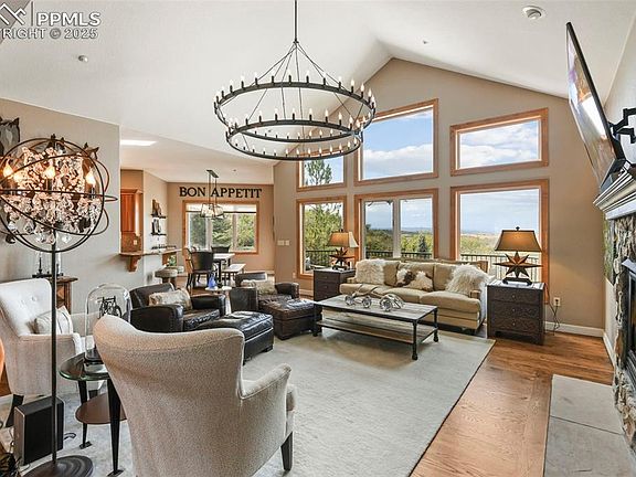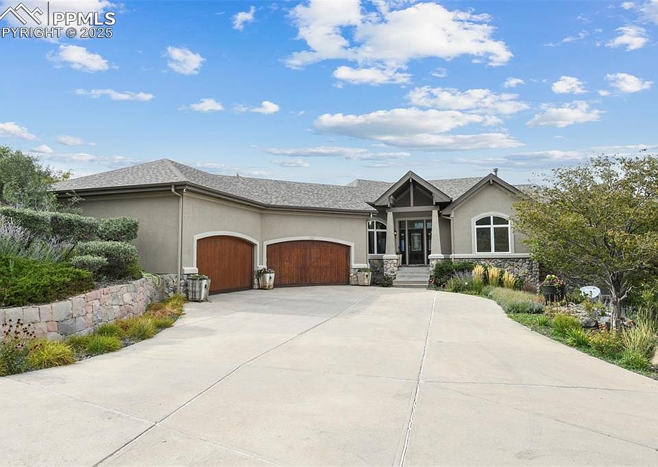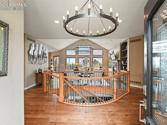Experience true Colorado living in this custom Bell Mountain Ranch estate designed to blend timeless elegance with modern mountain updates. This thoughtfully designed floorplan offers 4 bedrooms, 4 bathrooms, 2 living spaces, a formal dining, and 2 flex spaces set on a scenic 6.4 acre lot with expansive mountain views. The striking spiral wrought-iron staircase anchors the entry, leading to open living spaces enhanced by three gas fireplaces and custom built-ins throughout. The main level showcases updated 5-inch plank hardwood floors, seamlessly connecting the formal and casual living areas. Indulge in the newly remodeled bathrooms, including a luxurious primary suite with heated floors. Every detail has been thoughtfully customized, from the designer lighting, paint, wood finishes, to the stucco and stone exterior and the oversized 4-car garage not to mention the practical updates such as a new roof, newer HVAC, and AC. Step outside to a large Trex deck and covered patio, perfect for entertaining or enjoying serene sunsets. With trails and open space nearby, plus easy access to I-25, this home balances privacy, recreation, and convenience. This is more than a home — it’s a private retreat where custom craftsmanship meets Colorado beauty.