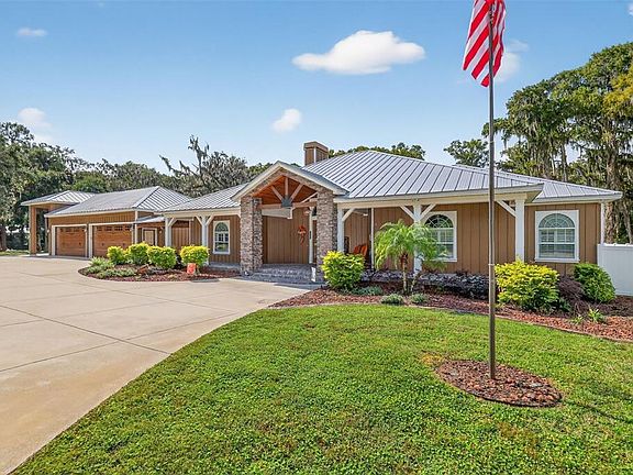 Escape to the perfect lakefront residence - thoughtfully designed for relaxing, entertaining, car hobbyists or those wanting to keep all their accessory vehicles at home! Situated on 16+ acres of beautiful Florida landscape, this site offers approximately 460' of DIRECT FRONTAGE ON LAKE HARRIS, the crown jewel of the Harris Chain of Lakes with 70,000 acres of waterways to explore right from your own backyard. The CUSTOM DOCK built in 2017 offers TWO COVERED LIFTS - one for a bass fishing boat (approx. 3000 lb. rated) and a second covered lift for a pontoon boat (approx. 7500 lb. rated), a storage closet, and UPPER LEVEL SUN DECK. After a day on the water, enjoy the SPARKLING POOL with a sun shelf, built-in table, LED lighting, and gas heated spa. The SCREENED IN LANAI is outfitted with a gas firepit for the evenings and an amazing SUMMER KITCHEN with a large sit-at-bar, cabinets, sink, disposal, microwave, refrigerator, TV, and pool table. This space was pre-planned (pre-wired for HVAC + insulated attic and walls) with a full bathroom (instant hot water) and offers an additional outdoor living area, or it could be enclosed if desired. The residence also offers a 30' x 40' ATTACHED GARAGE to accommodate up to 4 vehicles, and there's also an attached covered 14' x 50' RV PORT with electrical hookup. The OVERSIZED DRIVEWAY AND PARKING PAD have 6" poured concrete for durability. Those with off-road vehicles, motorcycles, or maybe have a business will appreciate the detached 40' x 60' (2400 square feet) WORKSHOP features a metal roof, foam insulated attic and walls, TWO 14' ROLL UP DOORS with openers, 5-ton HVAC unit and a ductless unit in the interior office. The 2011 CUSTOM-BUILT home feels timeless, yet transitional with wood floors, a wood burning fireplace, and a split floor plan for privacy. The well-equipped kitchen makes entertaining effortless with a raised breakfast bar, convenient island for meal prep, built-in ovens, cooktop, and abundant gorgeous cabinetry, with glass inserts to display your favorite dishware. The primary suite offers access to the pool lanai, separate walk-in closets, an ensuite bathroom with granite topped dual vanities, soaking tub, and a large walk-in tiled shower featuring 3 shower heads. Enjoy the sounds of the season with a BOSE SOUND SYSTEM with remotes, a convenient laundry room fitted with a work desk or drop zone, security and camera system, Hardie-board siding, foam insulated attic, and a COMMERCIAL GRADE METAL ROOF round out the many desirable components of a home that was well built and designed for efficiency. Travel to Orlando airports and theme parks is approximately 1 hour, or just 15 minutes to the Leesburg International Airport for general aviation enthusiasts. This property is a one-of-a-kind on the Harris Chain of Lakes, ideal to live, work, or play! Call for a private tour and make this Lake Harris home your next address!