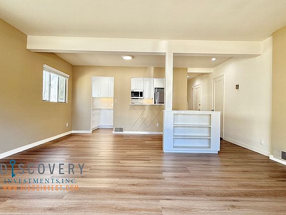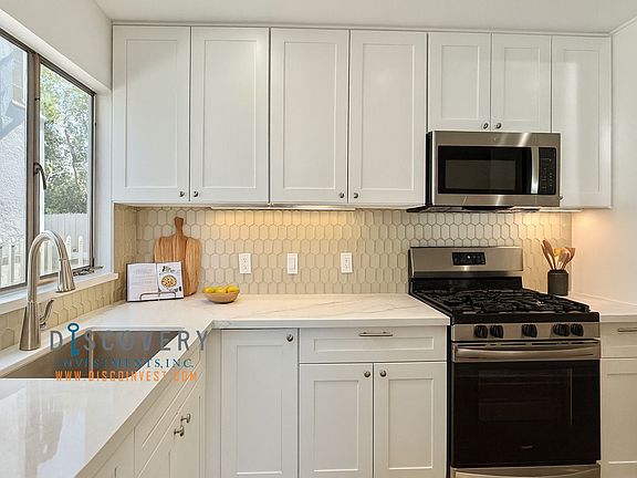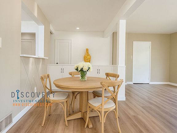 Step into a spacious living room filled with natural light from large picture windows, creating an inviting and airy atmosphere. The adjacent dining area features built-in cabinetry and a service window that opens into the newly renovated kitchen. Designed with a contemporary touch, the kitchen offers sleek finishes, ample storage, and newly updated appliancesperfect for modern living.