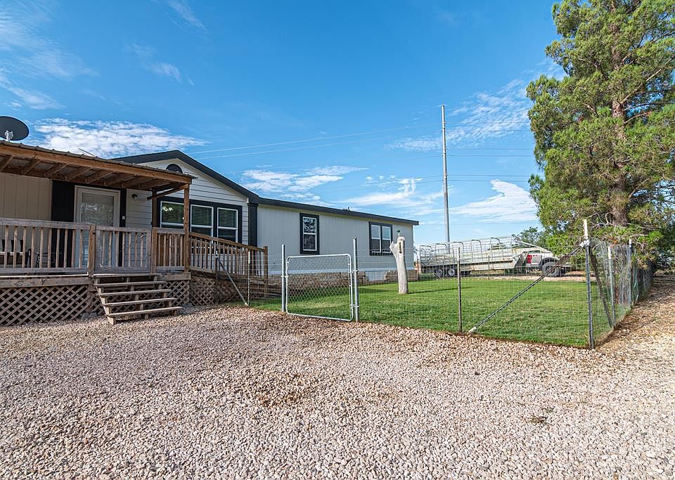 Wide open spaces meet fresh country charm on nearly 4 acres surrounded by mature pines and fruitless trees! Enjoy peaceful living with easy access to I-20 and all Midland conveniences. This beautifully refreshed, well-maintained double wide offers 4 bedrooms, 2 baths, an open layout, and a large kitchen perfect for gatherings. Relax on the spacious front porch and take in the quiet views. Updates include a new roof, new windows, and fresh interior and exterior paint. Bright, inviting, and move-in ready—your ideal country retreat!