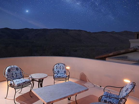 Beautiful, large home on 37 acres with lots of extras: home office, pool, spa, fountains, roof top viewing deck, yoga room, library, sauna, massage room and more! Property has private access into Saguaro National Park and Rincon Mountains. Remote, peaceful and stunning location. No expense was spared on home and it is beautifully designed. On the North side of the home is the large primary bedroom wing with a long hallway connecting shared living spaces. The South wing has two more bedrooms with their own bathrooms. Library and fourth bonus bedroom. Office with full sized bed. Two living rooms. Large garage. Chef's kitchen. Large outdoor covered decks with fans and heaters. Fireplaces throughout. Large pool, roof top deck, huge covered bbq, sitting area, fireplace.Muleplw outdoor patios and sitting areas. Home is fully furnished. Trails through property and just a short walk to your private entrance to Saguaro National Park, the Arizona Trail and Rincon Mountains.