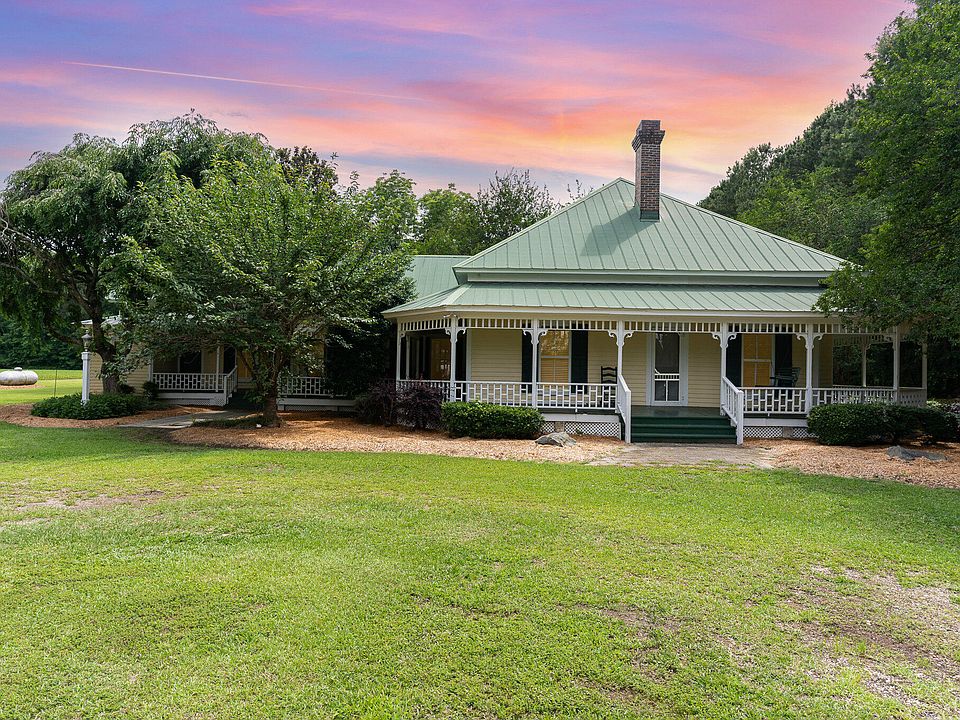 Charming Southern Farmhouse Retreat on Sprawling Acreage. Step back in time with this beautifully maintained classic Southern farmhouse, featuring a wraparound porch, charming architectural details, and tranquil surroundings. Nestled on a spacious and private lot, this 3-bedroom, 2-bath home boasts timeless appeal with modern comforts. The inviting front porch with intricate trim work and rocking chair space welcomes you home, perfect for enjoying peaceful mornings or vibrant sunsets. Inside, you'll find a warm and welcoming interior with hardwood floors, high ceilings, and ample natural light throughout. A metal roof adds both charm and durability, while mature trees and thoughtful landscaping enhance the idyllic country setting. The property includes a detached structure perfect for storage or an outdoor workshop. There's plenty of room for gardening, recreation, or simply enjoying nature's beauty. Whether you're looking for a quiet retreat, a charming family home, or a property with character and room to grow, this picturesque gem is a must-see. There is a lot of potential for this charming historic home.