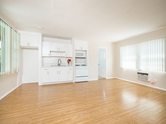 Living Area has fresh paint, wood floors, a wall air conditioner unit, wall gas heater on a digital thermostat, ceiling fan with a light fixture on a dual dimmer switch, closet with sliding mirrored doors, USB port/outlet for convenient charging, and large double pane windows with new wooden horizontal blinds.