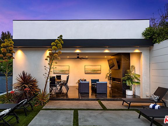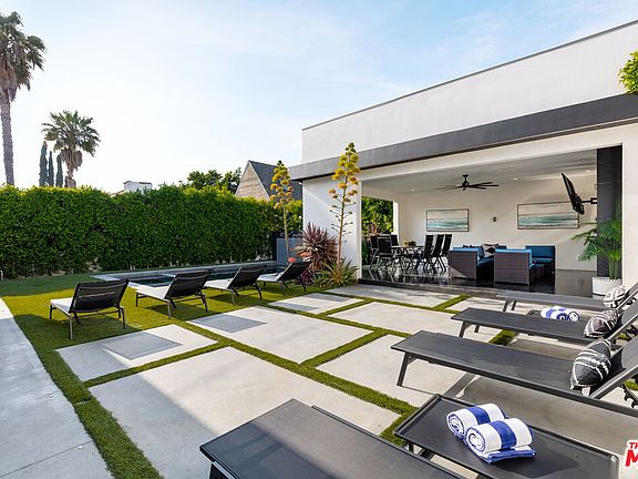 Welcome to this fully furnished, exquisitely done 2020-built Beverly Grove modern set behind gates and privacy hedges. Enter to discover wide-plank wood floors flowing throughout the open-concept floor plan. The living room includes picture windows and frosted privacy glass, adjacent to the formal dining room and partitioned by a floor-to-ceiling glass wine display. The family room is centered by a commanding stone fireplace and features Fleetwood doors that open to the outside, creating a seamless indoor-outdoor flow ideal for entertaining. The kitchen boasts custom cabinetry, a waterfall island with a cooktop, and top-of-the-line appliances. Downstairs includes a state-of-the-art theater with full-wall projection, surround sound, premium insulation, and amazing acoustics, as well as a game/entertainment room with a wet bar plus a guest bedroom. The primary suite offers a fireplace, private balcony with treetop and palm views, and a spa-like bath with elegant stonework, dual-sink vanity, extra-large shower with bench, soaking tub, and private toilet room. A junior primary has picture windows, a private terrace accessed by sliding glass, and an en-suite bath with a shower. Secondary bedrooms and bathrooms are spacious and light-filled. Upstairs also features convenient side-by-side laundry. The backyard includes a pool and spa with a water feature, an outdoor cabana, and a built-in fire pit. Enjoy a fantastic lifestyle in this prime Beverly Grove location near The Grove, Original Farmers Market, Melrose, Miracle Mile, Beverly Center, West Hollywood, Beverly Hills, and the very best of the Westside. Property will be available for showing on Nov 10th, 2025.