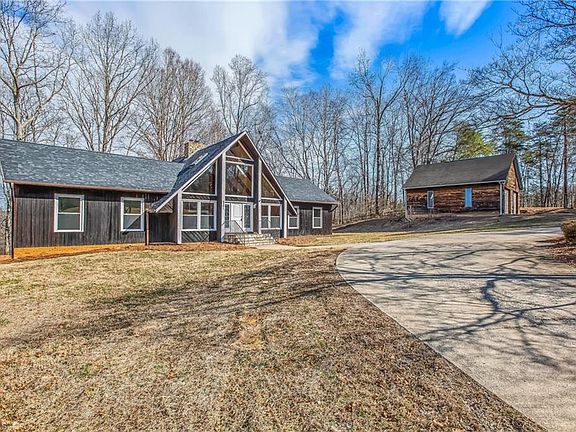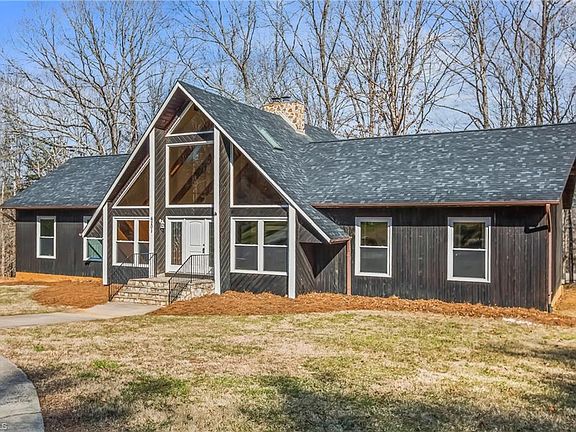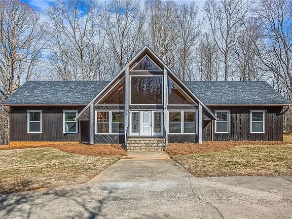 Stunning updated 1.5-story cabin nestled on 1.2 acres in peaceful Rural Hall. The great room has a towering stone fireplace, vaulted ceilings, & skylights. The split floorplan offers privacy & convenience, w/ the spacious primary suite on one side & 3 additional bedrooms on the other. The large primary bedroom boasts 2 W-I-Cs, & the ensuite has a garden tub & separate shower. The updated kitchen features SS appliances, granite countertops, & a built-in wet bar. Upstairs, you'll find a cozy loft space. The finished basement offers even more living space, w/ a 2nd fireplace, dry bar, & flexible office/gym area. Additionally, the basement features a half bath, laundry room, & plenty of extra storage. Basement-level garage has ample room for parking & storage. The large back deck is perfect for outdoor dining or relaxing. Property also includes a spacious 2-car detached garage & a 2-stall horse barn. The land is partially fenced. Other recent updates include: roof, windows, & Carpet.