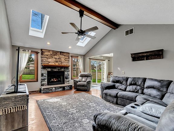 Welcome to this beautifully updated home that combines charm, functionality, and style in every corner. You’ll love the open floor plan, highlighted by vaulted ceilings with an eye-catching wood beam and natural light pouring in through skylights. The cozy stone fireplace and plank flooring throughout add warmth and character, while tile in the kitchen and baths ensures easy maintenance. The home features newer windows and doors, updated master and second bathrooms, and fresh light fixtures that give a modern touch. All appliances stay—including the washer and dryer—making this move-in ready gem even more appealing. Step outside to a fenced-in yard with a brand new fire pit, perfect for entertaining or relaxing evenings. Located just minutes from 469 for a quick commute, yet tucked away on a quiet dead-end street with little traffic, this home offers both convenience and peaceful living.