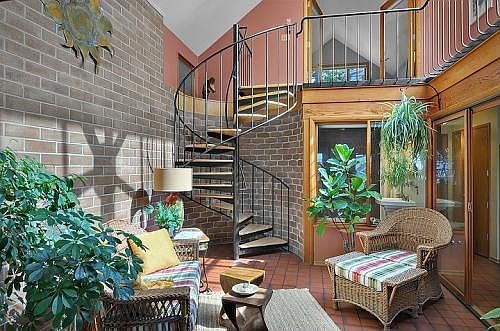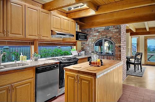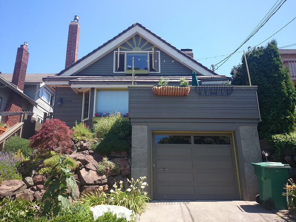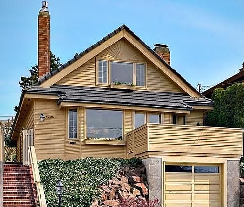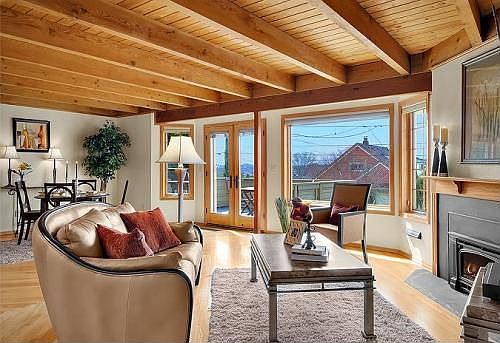 This unique passive solar home is sited proudly on Phinney Ridge with views of Puget Sound and Mountains. A neighborhood classic on the outside, the epitome of NW Contemporary Design on the inside! Light filled living room with wood beamed ceilings, oak floors, wood wrapped windows and gas fireplace. Dining and kitch share a see through fireplace off the atrium with skylights overhead flooding the home with natural light. Master on main plus additional master and guest room upstairs. Att garage.
