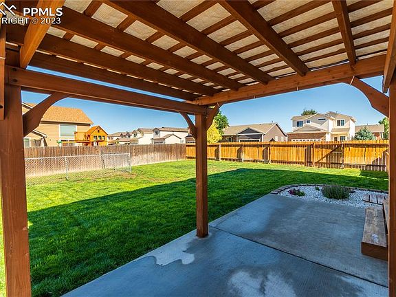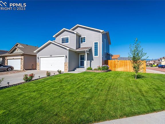 **SPACIOUS 2 STORY HOME AT A GREAT LOCATION WITH PIKES PEAK VIEWS!** This 3 bedroom home can easily be converted to a 4 bedroom by finishing the lower storage room. The home is nestled on a corner lot with welcoming curb appeal. As soon as you step in the front door, you'll appreciate the inviting 2 story entry with ample natural light. The open-design living room flows to the kitchen and dining area. Enjoy the warmth of your fireplace, and Pikes Peak views from the living room and dining area. French double doors lead from the dining area to a spacious back yard and patio. Spacious kitchen has been updated with tasteful 2-tone cabinet colors, stainless appliances, and new backsplash. Brand NEW CARPET through out! The Master bedroom also offers Pikes Peak views and opens to the Master Bath, complete with double sinks, walk in closet, and garden tub/shower lit with natural light from an upper transom window. The laundry room is conveniently located upstairs near the bedrooms and includes cabinet storage & counter to fold clothes. The secondary bedrooms connect via a Jack-and-Jill bathroom. The basement includes spacious finished rec room area, large unfinished storage room, and full bathroom. Enjoy Colorado sunsets from your spacious back yard with separate dog-run area, large storage shed,oversized concrete patio w/covered solid wood pergola. *WATER HEATER AND A/C REPLACED IN 2022.*