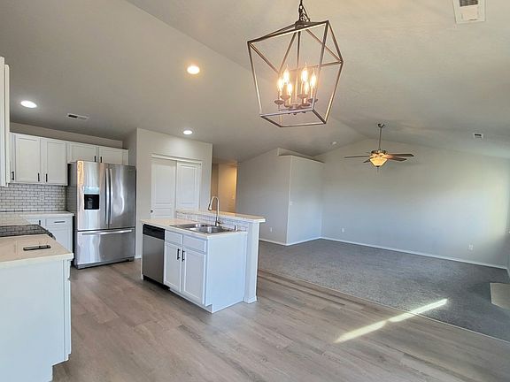This updated 3 bedroom 2 bath rambler in West Pasco features a split-bedroom layout and an open-concept great room with vaulted ceilings, new flooring, and a gas fireplace framed by double windows. The kitchen includes all appliances, a gas range, epoxy countertops, full tile backsplash, ample cabinetry, and a double-door pantry. The island houses the sink, dishwasher, and bar seating perfect for casual meals or entertaining.