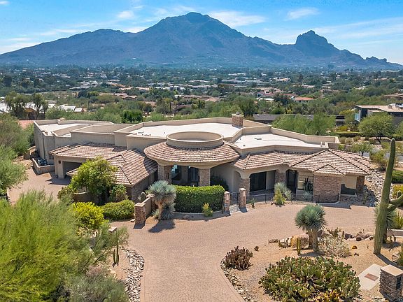 For those who want the ICONIC VIEW OF CAMELBACK MTN. This contemporary home captures expansive views of Camelback and Mummy Mountains from its elevated lot. Sophisticated yet warm this home sits in a premium area of PV surrounding by $10M+ homes. The open great room floor plan is designed to showcase the scenery while offering seamless living and entertaining. The home flows out to a gentle sloping backyard with multiple sitting areas, a negative edge pool and hot tub. The primary suite is split w 3 additional ensuite bedrooms for comfort and privacy. A separate den is thoughtfully placed between two guest rooms, a sitting /exercise room in the primary, plus a rich wood paneled office which has Mummy Mtn views. Remodel or enjoy the timeless style. New roof in 2023
