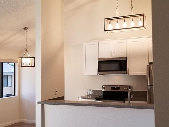 Be the first to occupy this pristine, newly renovated, one-bedroom, one-bath condominium available immediately. Renovation includes completely new kitchen and new bathroom with high-end materials, new appliances, new flooring, new window coverings, fresh paint, new lighting, etc. Vaulted ceilings and a balcony off the living room make this upper unit seem even larger than its 675 SF (approximate), and the southern exposure makes the living area in the condo feel particularly airy and spacious. The large bedroom (11x15) offers enough space for both sleeping and an office or lounging area. Overall, the unit provides tons of storage space with ample cabinetry and walls of closets. The condo also includes one parking space in a secure, two-car garage (below, shared with downstairs tenant) that also provides additional storage. Hot and cold water and trash collection are included you need only pay for your electrical usage. Located in southern University City, less than a 5 min walk to what you need: grocery store, drug store, bank, restaurants, coffee shop, dentist, urgent care, library, etc. Freeway close: 3 min (0.7 mi) to Hwy 52, less than 5 min to I-5 (2.5 mi) or I-805 (1.5 mi). If you prefer mass transit, it's a short walk to a bus stop with access to work areas (5 min on #105 to UTC Transit Center; 17 min on #41 to UCSD or VA). No smoking allowed (including on balcony) and no pets. BRAND NEW in unit: Stainless steel GE range with self-cleaning oven and glass cooktop Built-in microwave oven Stainless steel GE refrigerator Solid wood kitchen and bathroom cabinets with soft-closing drawers and stainless steel pulls Large, deep, stainless steel, Kraus kitchen sink with Moen faucet Quartz counter tops in kitchen (including breakfast bar) and bathroom Bathtub with high-end porcelain tile surround and Moen fixture Bathroom sink with Moen faucet, medicine cabinet, and mirror Light fixtures, switches (with dimmers in kitchen and dining room), etc. Wood-look plank flooring in living areas Bali vertical blinds Carpet in bedroom Fresh paint throughout Other amenities: Pool Lots of storage (in both cabinetry and walls of closets) Garage parking space with storage in secure, shared two-car garage with garage door opener remote Hot and cold water included Laundry facilities in the building Trash and recycling collection Easily accessible guest parking Owner pays for hot and cold water and trash collection. Tenant pays for electricity use.