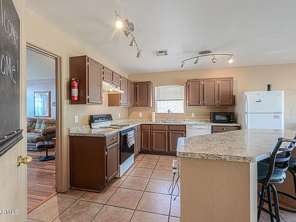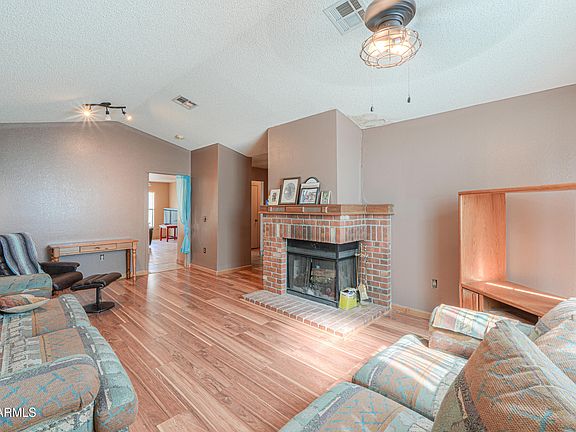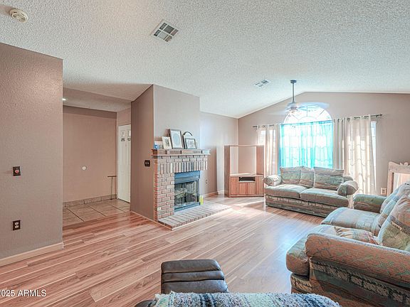 Discover an affordable opportunity with this charming 4-bedroom, 2-bath home on a corner lot with no HOA! Featuring 1,605 sq.ft. of comfortable living space, this home offers an inviting family room with a cozy fireplace and a great room large enough for dining and entertaining. The kitchen opens to the main living area, creating an easy flow for everyday living. The primary suite includes a walk-in shower, single-sink vanity, and plenty of natural light. Enjoy Arizona's sunshine in your own backyard oasis with a refreshing play pool. Roof replaced about 3 years ago; A/C also updated. Situated on a 6,931 sq. ft. lot in an established neighborhood - close to schools, shopping, and major routes. A wonderful canvas to update and make your own!