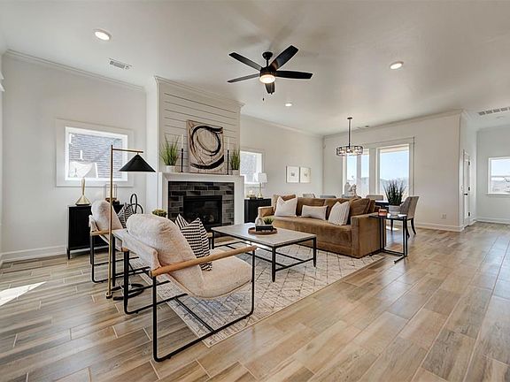 The Newport at Covell Valley is located within the Edmond school district which is one of the best in Oklahoma. Featuring the After 5 design package, this 2 story residence showcases an open floor plan layout, and bonus loft space. The open kitchen and living area boast a gas fireplace, wood tile floors, a generous island, pullouts in the cabinets, and a walk in pantry. The spacious primary suite provides a retreat on the backend of the house with a large walk in closet, 6ft tub, and a shower with schluter waterproofing. In the hallway off of the kitchen is a half bath, large storage space under the stairs, a mud bench and the laundry room. Upstairs, there are two decent size bedrooms with walk in closets, a full bath, and a bonus loft space that could be used as a play area, reading corner or game room. Off of the dining room is a covered back porch, perfect for your patio furniture and sits on a 0.14 acre lot with the backyard facing south. Additional features to this home include a full sprinkler system, tankless water heater, healthy air filtration system, smart system, and a storm shelter. This Zero Energy Ready Home is unrivaled among other energy-efficient homes with its superior design and construction. Adhering to the highest standards for energy efficiency, comfort, and air quality, it promises long-term savings. Some innovations include a thermal enclosure, water and moisture barrier, ENERGY STAR appliances, high-performance windows, a perfectly sized HVAC system, and so much more. The Covell Valley community is in a perfect location being only 1 mile from the I-35, and close to some of the best schools.