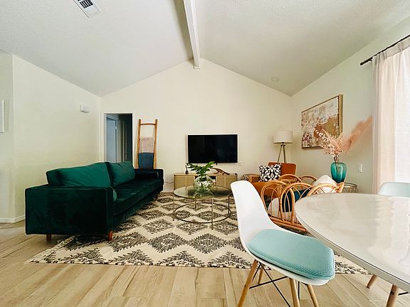 Furnished house for short term or long term stays (1-12 months). 2 queen beds, 1 king bed and 2 full bathrooms. Living space and more. Style is mid century modern.