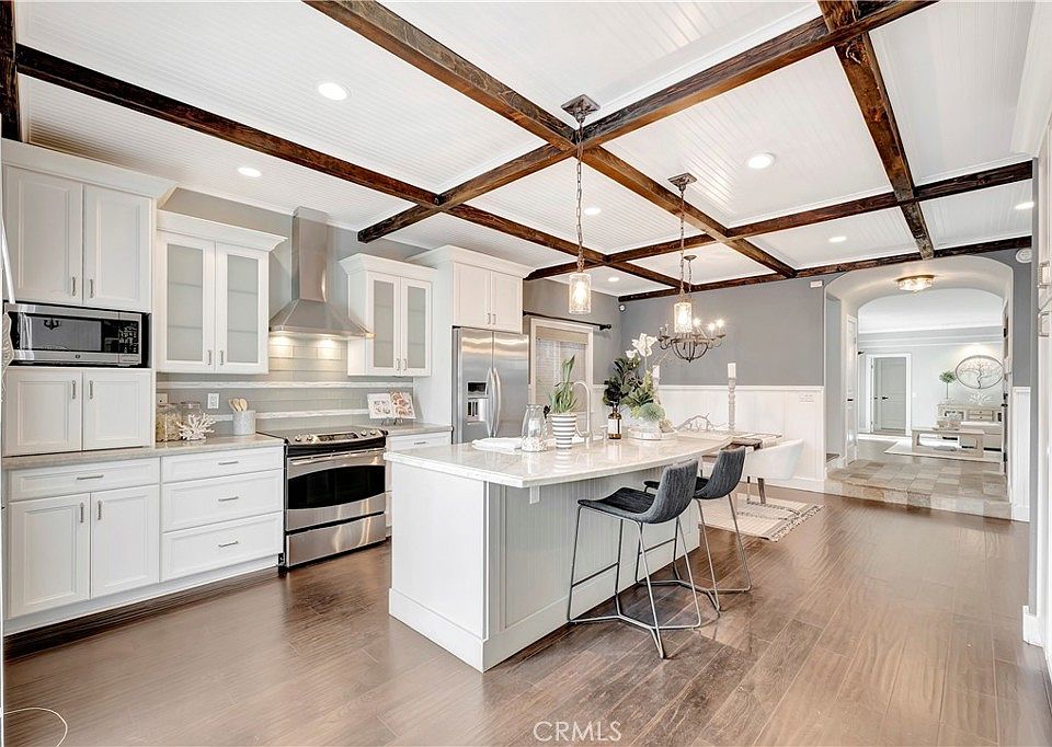 Just five blocks from the sand and a couple blocks from the heart of downtown, this exceptional Huntington Beach home embodies the essence of modern coastal living. Spanning approximately 2,700 square feet, it combines refined design, custom craftsmanship, and effortless livability in one beautifully curated package. Inside, natural light and elegant upgrades define the open-concept layout. The main level features a welcoming living room with a cozy fireplace and access to a private side yard, a half bath, and a convenient laundry room with sink that connects directly to the two-car garage. The chef-inspired kitchen is a true centerpiece, showcasing custom ceiling with wood beams, shaker cabinets, a spacious center island with bar seating, a built-in breakfast nook, and premium stainless steel appliances. The space flows easily into the formal dining area and out to a private front patio complete with a firepit, perfect for relaxed evenings and ocean breezes complete with a gas line to easily add a built-in BBQ center. Upstairs, the primary suite offers a tranquil escape with a double-sided fireplace, a generous walk-in closet, balcony, and a spa-caliber bathroom with dual vanities, a soaking tub, and a walk-in shower. Two additional bedrooms and bathrooms are thoughtfully positioned nearby, while a bonus room with soaring ceilings and a fireplace creates the perfect spot for a media room, lounge, or home office. A versatile loft on the upper level opens to the rooftop deck, where panoramic views set the stage for unforgettable entertaining or quiet sunset moments. With three fireplaces, stylish hard-surface flooring, custom paint, new tankless water heater, outdoor shower on side patio and designer touches throughout, this home exudes warmth and sophistication. Blending the ease of indoor-outdoor living with the unbeatable proximity to the ocean, dog beach, and downtown’s premier shopping and dining, it represents the best of Huntington Beach coastal luxury all in an award winning school district!
