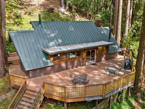 Tucked away in a magical, hidden canyon, this serene 9-acre retreat offers the perfect blend of privacy and natural beauty with newly installed Starlink. The main house features 3 beds, 2 baths with a studio above the barn! New interior barn doors just added! Just minutes from Corralitos Sausage, the Corralitos wine trail, and miles of scenic hiking and biking, this peaceful escape feels worlds away. Inside, the home exudes classic woodsy charm with high, open-beam ceilings and expansive picture windows that frame breathtaking views of the surrounding forest. Cozy nooks invite you to curl up with a book and a cup of coffee while the soothing sounds of the creek enhance the tranquility. Enjoy the expansive decks and outdoor living. Vacationers love this enchanting hideaway, as it has been a popular short-term rental. Enjoy a sun-drenched meadow, enchanting redwood fairy rings, and the ultimate in seclusion and serenity. A detached garage/workshop with a bonus space above completes this one-of-a-kind retreat.