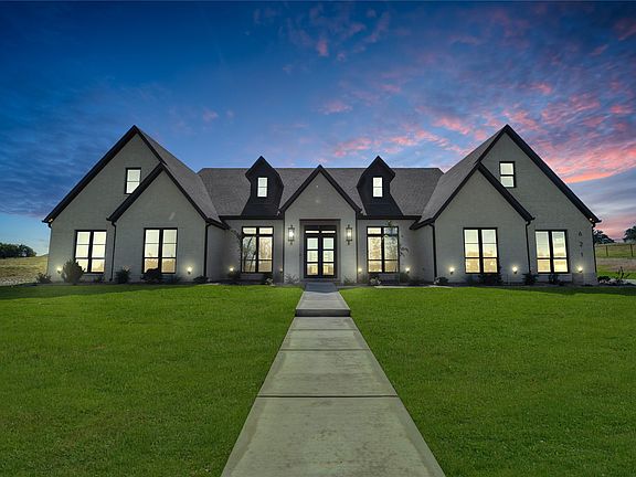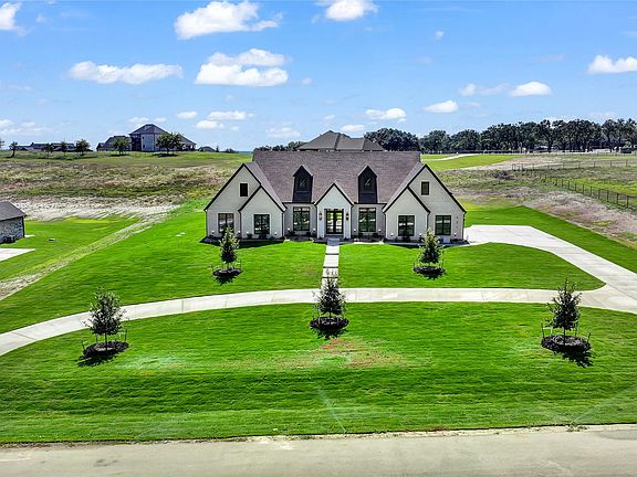 From the moment you arrive, the stunning curb appeal sets the tone for what awaits inside. Set on 2.01 acres in prestigious Santana Ridge Estates within Brock ISD, this 3,915 SF residence blends timeless craftsmanship with modern sophistication. Step inside to a breathtaking open-concept layout, anchored by a chef’s kitchen with commercial-grade appliances, a striking drop-edge Taj Mahal quartzite island & surrounding counters, wet bar & walk-in pantry. Inset oak cabinetry throughout provides a seamless blend of elevated design & functionality, while hand-scraped hardwood floors & designer fixtures enhance each room. The centrally located dining area wows with overhead box beams, brick pillar accents & doors that open to the expansive patio. The living room’s floating gas fireplace framed by arched built-ins adds a touch of French-inspired charm & warmth. An inviting office showcases French barn doors & a striking accent wall. With 5 bedrooms, this home offers exceptional flexibility. The primary suite is a true sanctuary, featuring a spa-inspired ensuite with a massive walk-through dual-head shower, bold black soaking tub & a focal-point tile wall with chandelier. A convenient pass-thru leads to the spacious laundry room with utility sink, abundant storage, and drip-dry area. A 2nd primary suite offers ideal space for guests. Three additional bedrooms are thoughtfully arranged downstairs, including a spacious flex suite or 5th BR with double doors to the back patio & large ensuite bath. Upstairs, a huge bonus room with full bath & storage closet creating the perfect retreat for play or work. High ceilings, expansive windows, and an open layout flood the home with natural light, showcasing the incredible detail & craftsmanship throughout. Outdoors, enjoy wide-open skies & room to roam—horses permitted—private septic, ATT fiber, buried utilities & quick access to I-20. Just 10 minutes from Downtown Weatherford, this isn’t just a home—it’s luxury living at its finest.