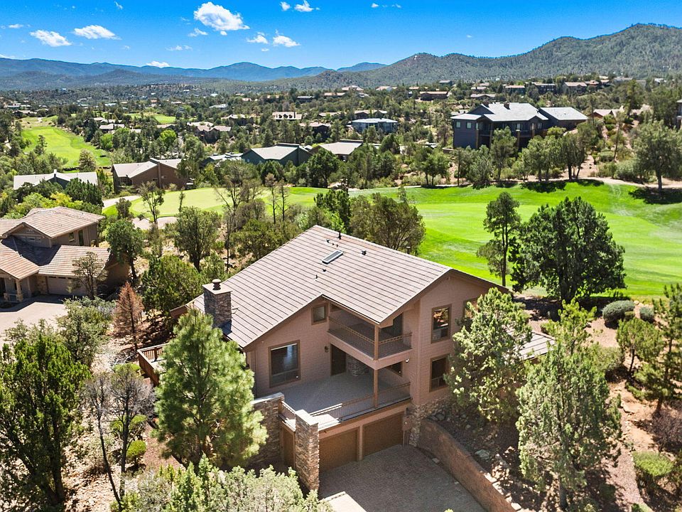 Experience golf course living at its finest in this beautiful home located on the first hole of the prestigious Capital Canyon Golf Club. Designed with a spacious, open floor plan, this residence features warm hardwood floors, soaring beamed ceilings, and a striking stacked stone fireplace as its centerpiece. Expansive picture windows frame sweeping views of Thumb Butte, the Bradshaw Mountains, the City of Prescott, and beyond.