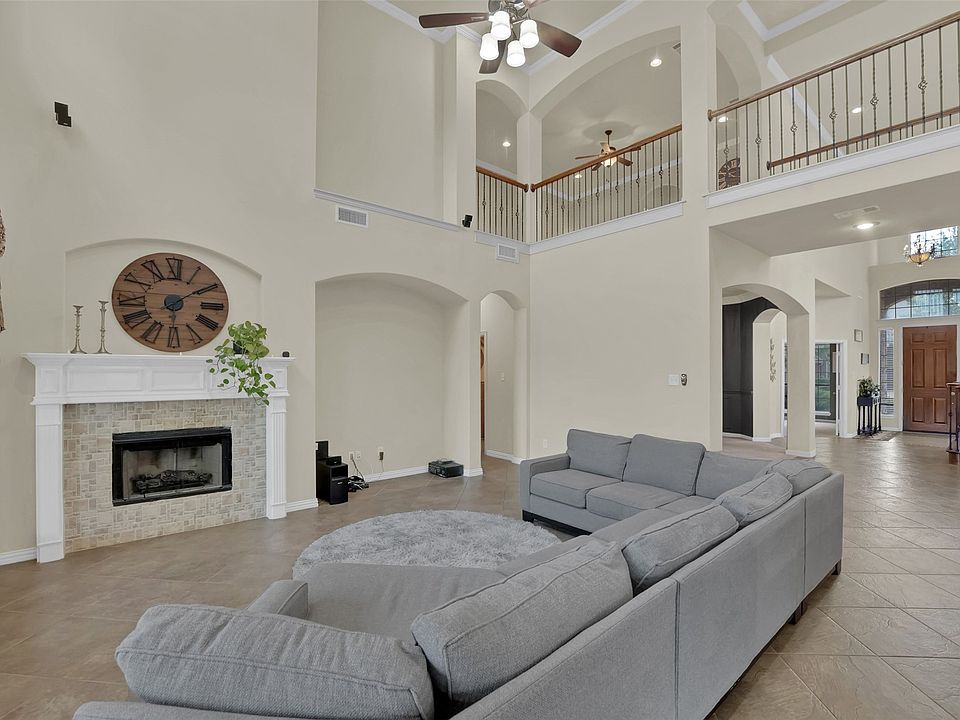 Welcome to this beautifully maintained 5-bedroom, 3.5-bathroom home with a thoughtfully designed layout, soaring ceilings, and elegant finishes throughout. This home features major upgrades, including 2 new tankless water heaters (2023), 3 new HVAC systems (2023), new cooktop, range hood, and dishwasher (2023), plus fully renovated primary and upstairs bathrooms (2023). All of this, paired with fantastic curb appeal, professional landscaping, and a spacious 3-car garage, make this property truly move-in ready. Step into the grand entryway that opens to the first living area and a sweeping staircase with wrought-iron balusters. To the right is a private office with French doors, perfect for working from home. Across the entry is a formal dining room with designer touches and a modern chandelier—ideal for entertaining. Continue into the heart of the home, where the main living room offers a dramatic two-story ceiling, a wall of windows, and a cozy fireplace. The open-concept kitchen is a chef’s delight, featuring granite countertops, a center island, and stainless steel appliances, all overlooking the sunny breakfast nook. The primary suite is privately located downstairs, showcasing a luxurious, fully updated spa-like bath with dual vanities, soaking tub, frameless glass shower, and a large walk-in closet. A guest suite is also conveniently located on the main level. Upstairs, you'll find two additional bedrooms with a Jack & Jill bathroom and a versatile family loft—perfect for a game room, media space, or teen lounge. Enjoy quiet evenings on the covered patio overlooking the landscaped backyard. Community amenities include pools, playground, park, jogging & bike trail, walking distance to the elementary school, minutes away from shopping, dining, & entertainments, a truly wonderful property which you can call home.