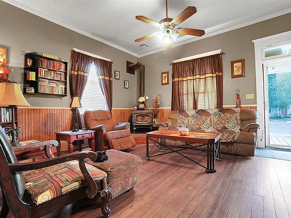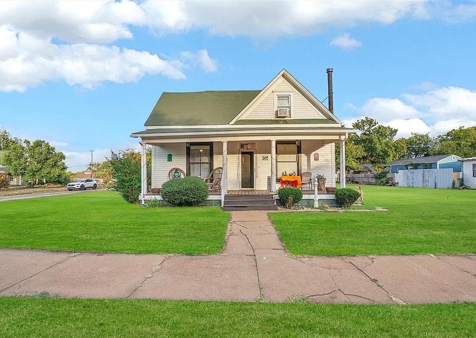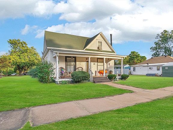 This gorgeous Farmhouse style home with 3 Bedrooms and 3 Full Bathrooms has so many unique items. From the large Covered Front Porch to the Gorgeous Hardwood floors to the Beautiful staircase and interior stained glass this home checks so many boxes that you just have to see it ! Large Living has fireplace and is open to the Dining area. Main Floor also houses two Bedrooms and a Magnificent Primary Bedroom with Private Bathroom. Upstairs you will find a Large Bedroom and Private Bath. Great details throughout this home that ooze warmth and coziness. You will fall in love so call now to view ! Large corner lot, Storm Shelter and so much more !