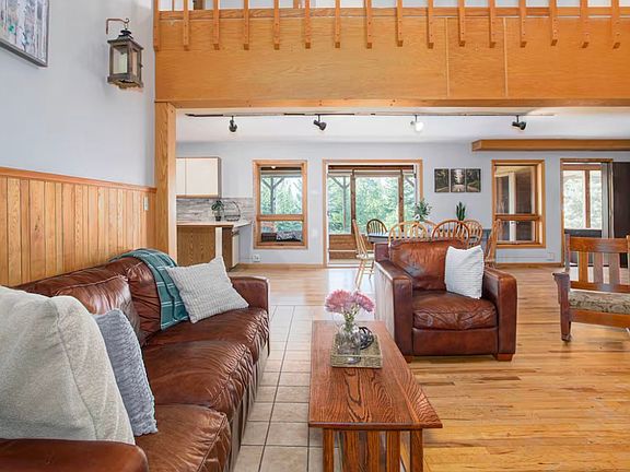 The main level features a spacious wrap-around porch. Inside, you'll find a full kitchen, a convenient laundry area, and a vaulted ceiling living room that enhances the sense of openness. A cozy office nook and a 4-season sun room provide stunning Aurora views without the chill, making it a year-round haven.