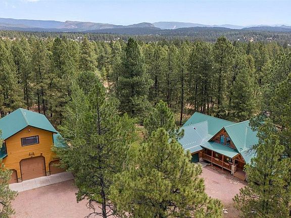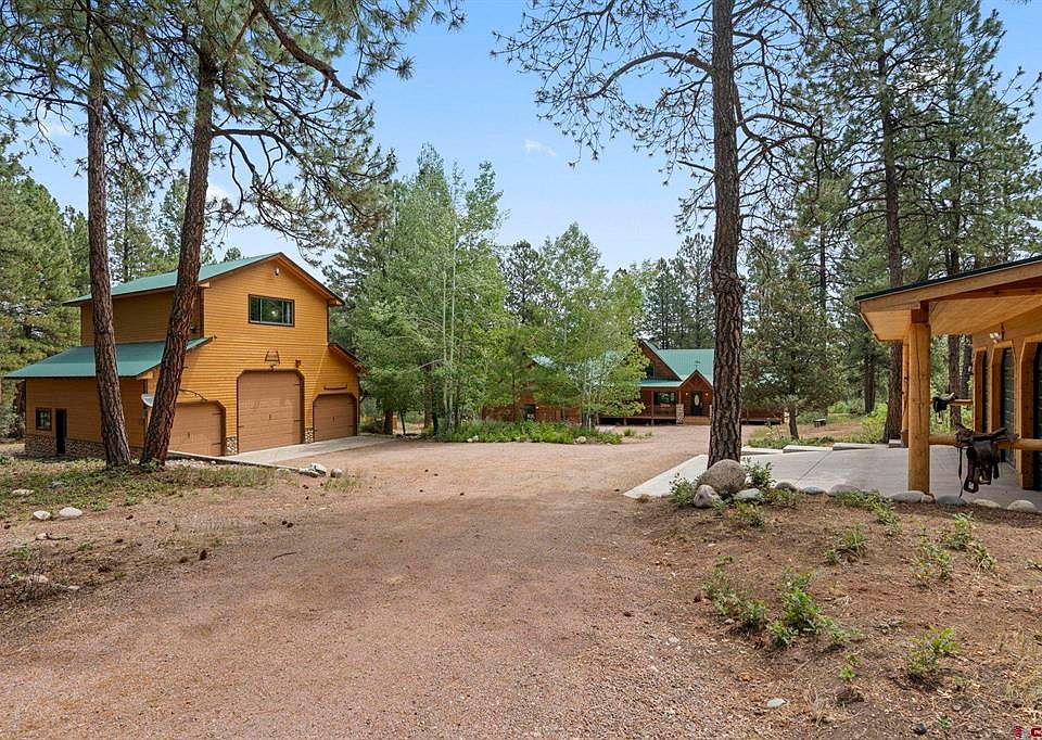 Experience the best of the Durango lifestyle - a rare opportunity featuring 8 garage bays and a custom log home. This private 4.74-acre property offers exceptional privacy and mountain character just minutes from Lake Nighthorse and 15 minutes to Downtown Durango. The 3,381 sq ft home blends mountain charm with thoughtful design, featuring vaulted ceilings, a floor-to-ceiling stone fireplace, radiant in-floor heating, and large windows that fill the space with natural light. Designed for easy single-level living, all bedrooms and bathrooms are located on the main floor, with a flexible loft space upstairs - ideal for a reading nook, personal office, or second living area. The primary suite sits privately in its own wing, with oversized windows, dual closets, a walk-in shower, and dual sinks. Additional highlights include wide hallways for accessibility, covered front and back porches, and high-efficiency systems such as reverse osmosis, whole-house filtration, a water softener, and instant hot water circulation. The property also delivers outstanding garage and storage options, with an oversized 2-car attached garage, two detached 3-car garages, and a dedicated RV bay with full hookups to water, septic, and electric. An additional RV parking area beside the home also includes hookups. Above the barn garage, you'll find a 600 sq ft finished bonus room with abundant natural light and its own efficient systems - offering extra space for guests, hobbies, or remote work. Located in the desirable Shenandoah neighborhood with paved roads and central water, this private setting offers a functional lifestyle with seamless access to recreation.