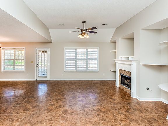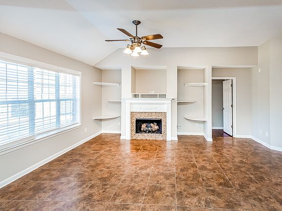 You won't believe the 2,408-square-foot Olive Branch rental home with four bedrooms and three bathrooms. An enormous open-plan space holds the living room, dining room, and kitchen. The living room has a fireplace surrounded by built-in shelving, a beautiful ceiling fan light, and a door that opens to the covered patio. The eat-in kitchen makes meal preparation and clean-up afterward easier thanks to its generous counter space and cabinet storage, double sink, and gooseneck faucet. The main bedroom is wonderfully large, and you'll enjoy the size and privacy of the en-suite bathroom with a walk-in closet, soaking tub, walk-in shower, and dual-sink vanity. Tour this rental home now and apply.