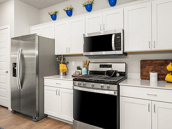 D.R. Horton's elegant Kerry floor plan offers open concept living in this one story home; Large kitchen with island and pantry, covered patio off of the great room that overlooks large backyard. The common living spaces include laminate flooring, white cabinets, white quartz counter tops in the kitchen and stainless steel 5 burner electric range, micro-hood and dishwasher. This home provides ample space for entertainment and plenty of room for hosting events.