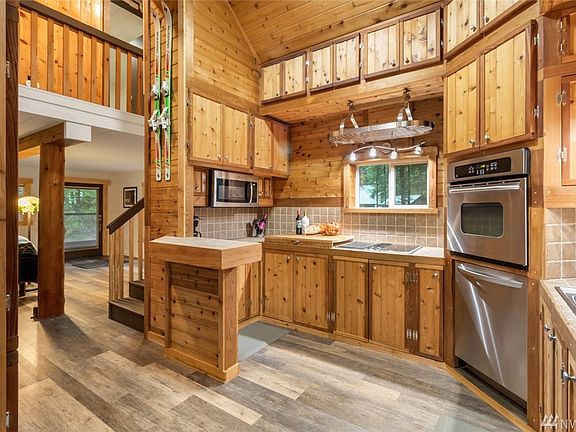 You'll never want to leave this handsomely remodeled Crystal River Ranch cabin tucked in the woods just 14 miles from Crystal Mountain Resort. 2 bedrooms + attic loft. Living room features gas fireplace w/native stone hearth. New cedar cabinetry, SS appliances, lower utility rm., wood-grain vinyl plank flooring, flawless mill work, siding & paint. Detached garage w/work area & stg room above. Dog run & big kennel + storage. All the work is done, just bring your boards & enjoy winter in mountains
