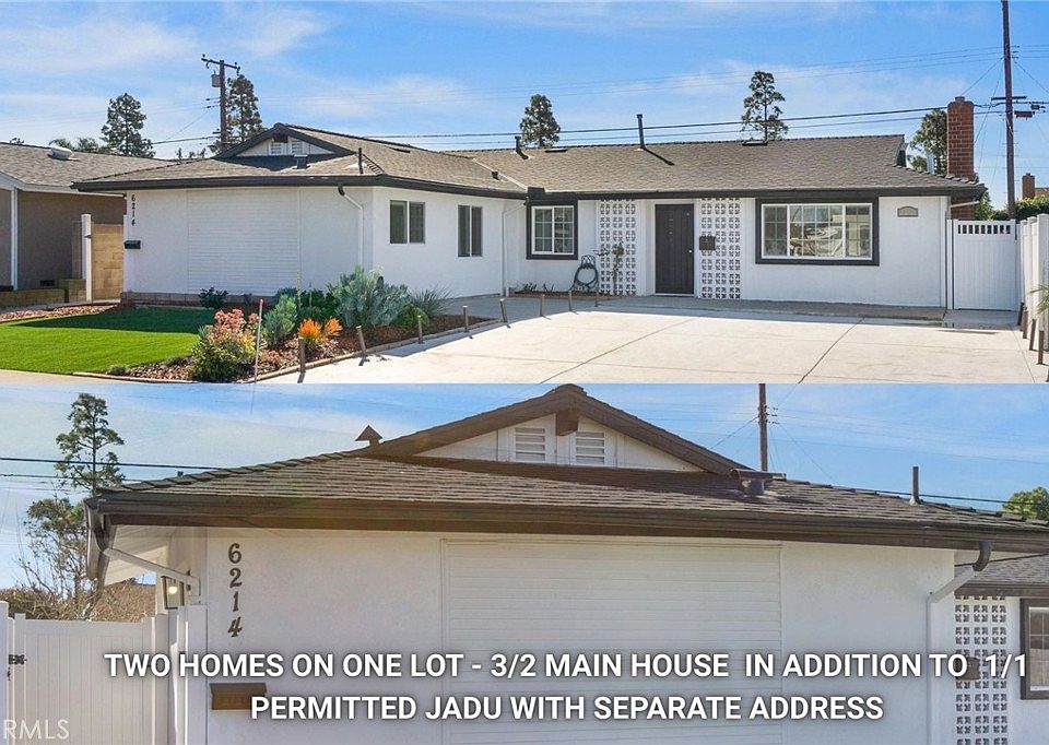The **permitted JADU at 6214 Santa Rita Ave** provides its own private entrance and address—an excellent setup for multi-generational living, a home office, or rental income (previously leased for approximately $1,900–$2,200 per month). The front driveway offers ample parking and curb appeal, framed by low maintenance landscaping.