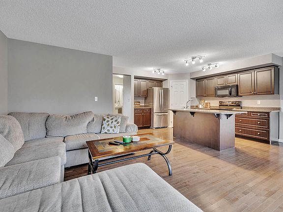 This half duplex is the perfect blend of style and convenience for professionals or first-time buyers! Step inside to find gleaming hardwood floors throughout the main level, which features a handy walk-through pantry, main floor laundry & a 2 pce bathroom. Kitchen has a large island with sink, great lighting, looking onto the dinette with a garden door to back deck. Space is open concept, inviting you to the living room. Upstairs, you'll find three comfortable bedrooms with plush carpeting, including a generous primary bdrm with a 4 pce ensuite & walk in closet. An additional 4-piece bathroom serves the other rooms. Enjoy outdoor living on the deck, leading to a yard that backs onto a tranquil trail. A/C & water softener system recently added. The location is unbeatable: you're just 15 minutes from the EIA, and a simple street crossing brings you to a school, parks, trails, & playgrounds! Complete with a single attached finished garage, located on a quite street, this home makes life easy & affordable.