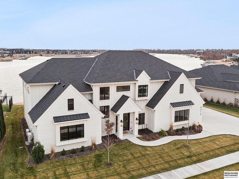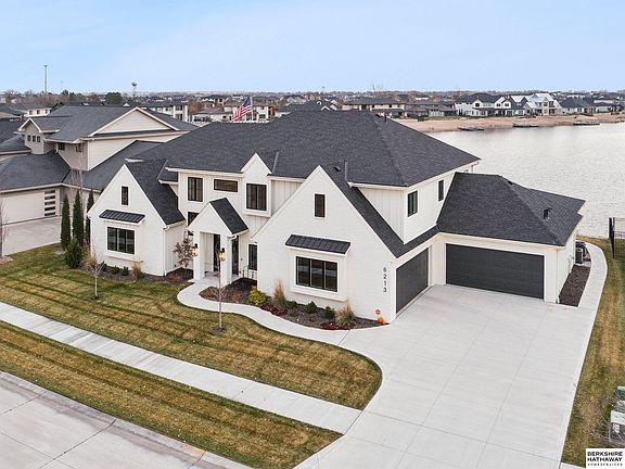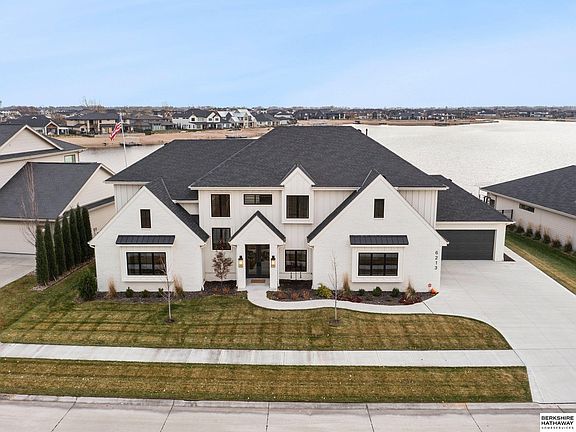 Vacation Everyday while minutes away from Expressway easy access to Omaha and Fremont. This luxury lakefront home in desirable Bluewater features Sandy beaches, lakeviews, sunrise and sunset views will captivate you. Expansive windows throughout create a peaceful indoor/outdoor experience. You will love the soaring ceilings, open concept great room with cozy fireplace, kitchen dining area. Gourmet kitchen with professional gas range, built in refrigerator/freezer, large island for gathering, walk in pantry and butler area.Patio area features gas firepit, beach access.Enjoy year round entertainment with your own sport court and fitness room! Upper level Primary Suite with dual vanities, soaker tub and walk in shower plus lake views. Loft recroom has is own deck to enjoy. Secondary bedrooms feature an on suite with 3/4 bath and 2 bedrooms with a full jack and jill. Upper level laundry for convenience. Special features include 4 car heated garage and bonus finished 20 x 20 storage room of